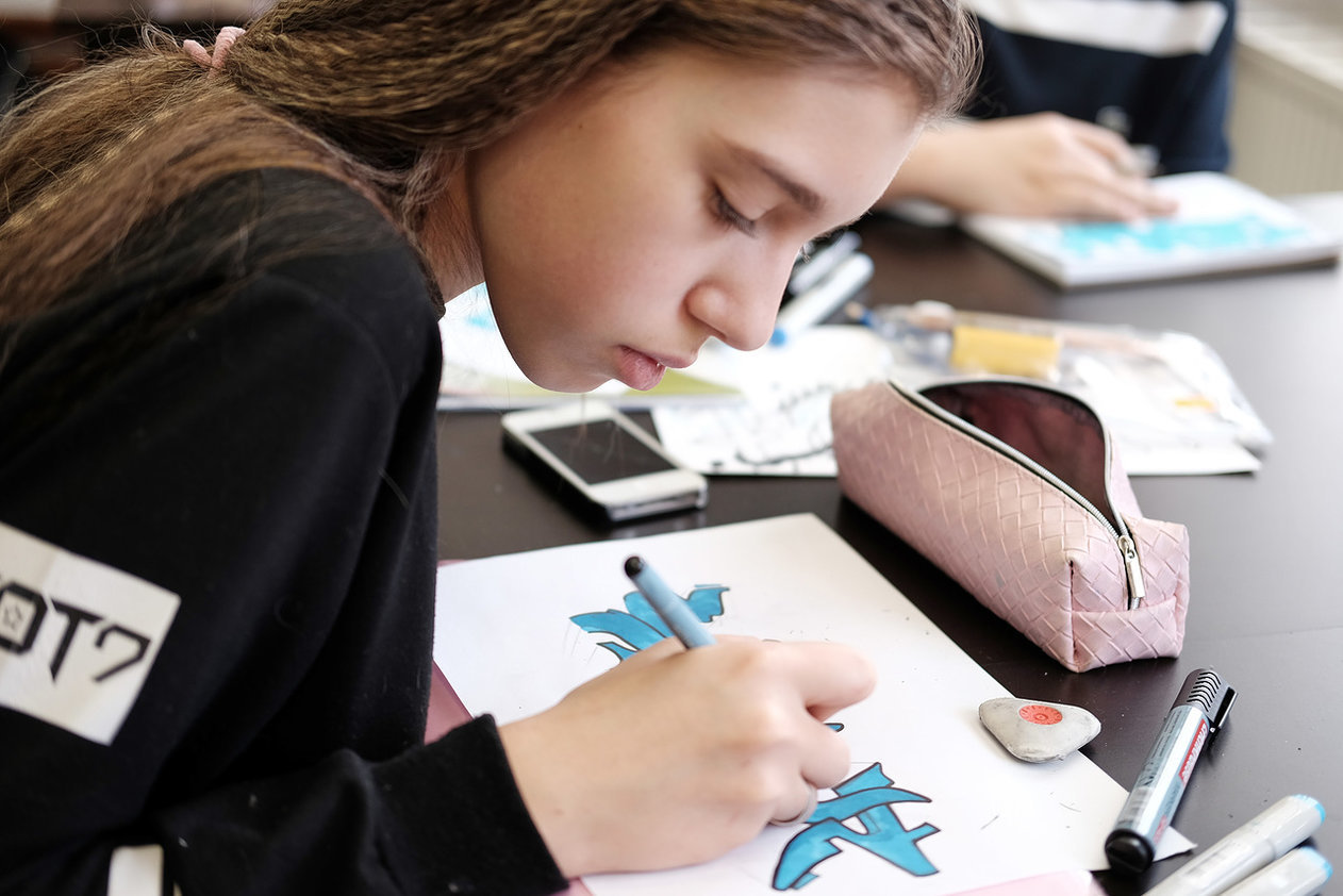 Граффити - это рисунки, изображенные с использованием аэрозольной краски в баллончиках на стенах зданий и других городских объектах . В школе мы учим ребят придумывать теги, шрифты, буквы, свой алфавит. Сначала обучение проходит на бумаге карандашом, линером и маркерами - создание скетча. После этого мы учим работе с аэрозольной краской для граффити на мастер-классах на стене.